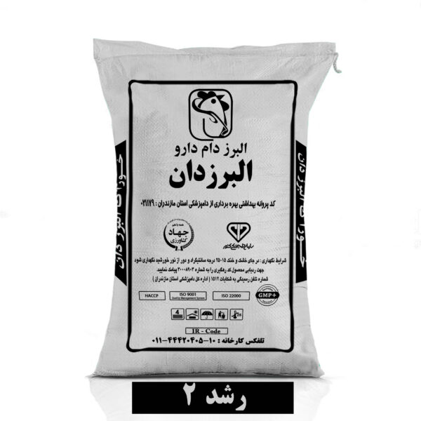Alborzdan Growth Two Feed is suitable for chicks aged 25 to 39 days. The consumption amount during this period is 2500 grams per chick. The product comes in pellet form, size 3/5, and is packaged in 40-kilogram laminated bags.